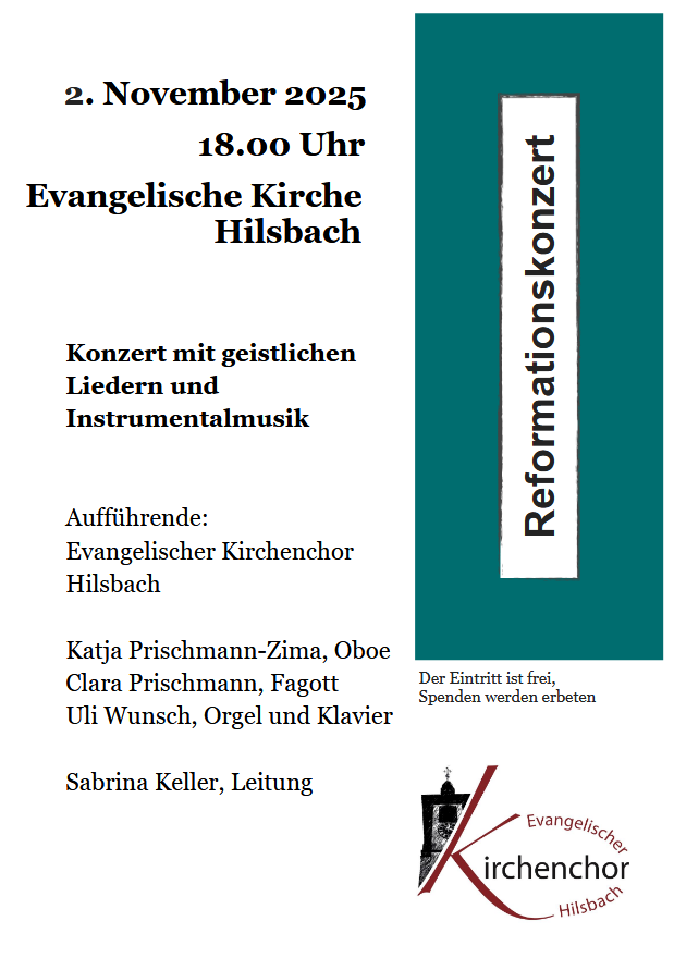 Konzert des Evangelischen Kirchenchors Hilsbach Herzliche Einladung zum Reformationskonzert des Ev. Kirchenchor Hilsbach am Sonntag, den 2. November 2025 um 18.00 Uhr in unsere Ev. Michaelskirche Hilsbach. In diesem Konzert feiern wir das 20jährige Dirigentenjubiläum unserer Chorleiterin Sabrina Keller. Wir haben wieder ein vielfältiges Programm vorbereitet. Als Instrumentalisten sind Katja Prischmann-Zima (Oboe), Clara Prischmann (Fagott) … [Weiter…]