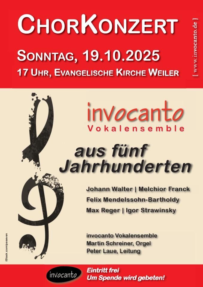 aus fünf Jahrhunderten invocanto Konzert am 19. Oktober Chormusik aus Renaissance, Barock, Romantik und Moderne – gesungen in den Originalsprachen Latein, Englisch, Französisch und Deutsch. Mit Werken von Johann Walter, Melchior Franck, Felix Mendelssohn-Bartholdy, Max Reger und Igor Strawinsky. Das invocanto Vakalensemble musiziert zusammen mit Martin Schreiner an der Orgel. Die Leitung hat Peter Laue. … [Weiter…]